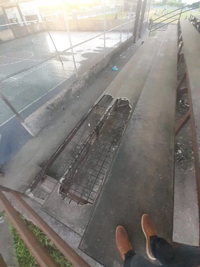 Grietas y desniveles en la superficie de juego, con alto riesgo de lesiones.